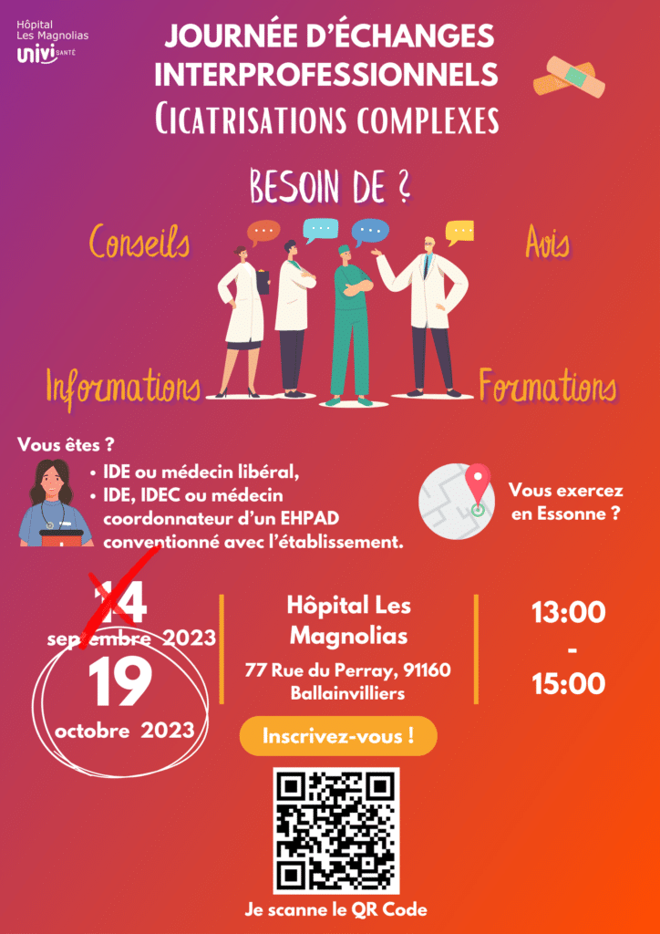 📧 Inscrivez-vous par email à avis.plaie@hpgm.mssante.fr, en précisant : Nom, Prénom, Fonction, Commune d’exercice ou scannez le QR code sur l’affiche.