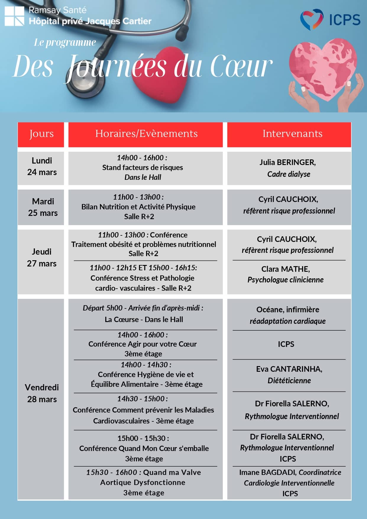 L’Hôpital privé Jacques Cartier est heureux de vous convier aux Journées du cœur du 24 au 28 mars au sein de l’établissement.